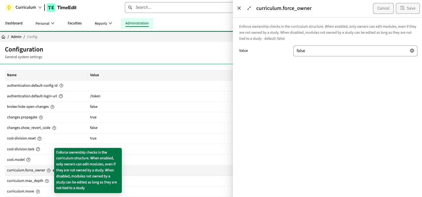 The configuration page is migrated to the new look and feel. The information shown to the administrator is improved with labels and additional background information when editing a configuration option.